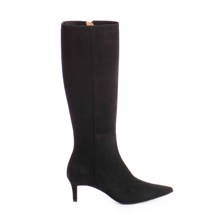 Cizme realizate din piele naturală velur neagră, cu o linie curată și construcție echilibrată. Tocul de 6 cm oferă stabilitate la mers, iar interiorul din piele naturală asigură o purtare confortabilă. Modelul este gândit pentru o așezare corectă pe picior și o susținere bună a gambei.