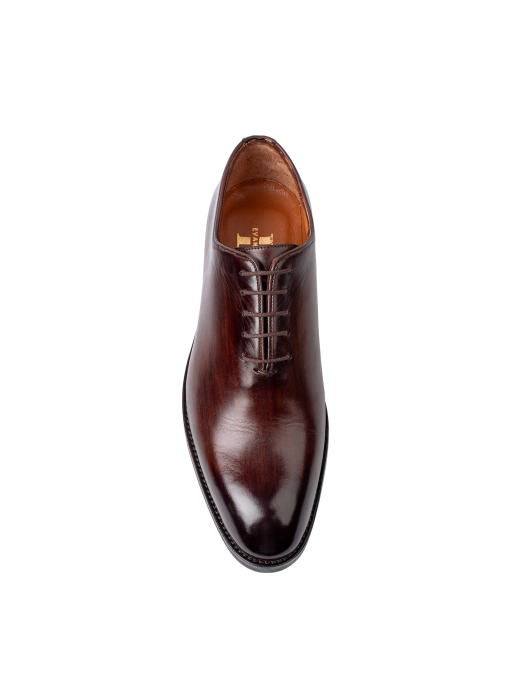 Modelul Derby Brown Patina este realizat din piele naturală de vițel, finisată manual într-o nuanță maro intensă, cu treceri subtile de culoare care evidențiază forma elegantă a calapodului. Liniile curate și construcția simplă îl fac potrivit atât pentru ținute business, cât și pentru combinații smart casual.