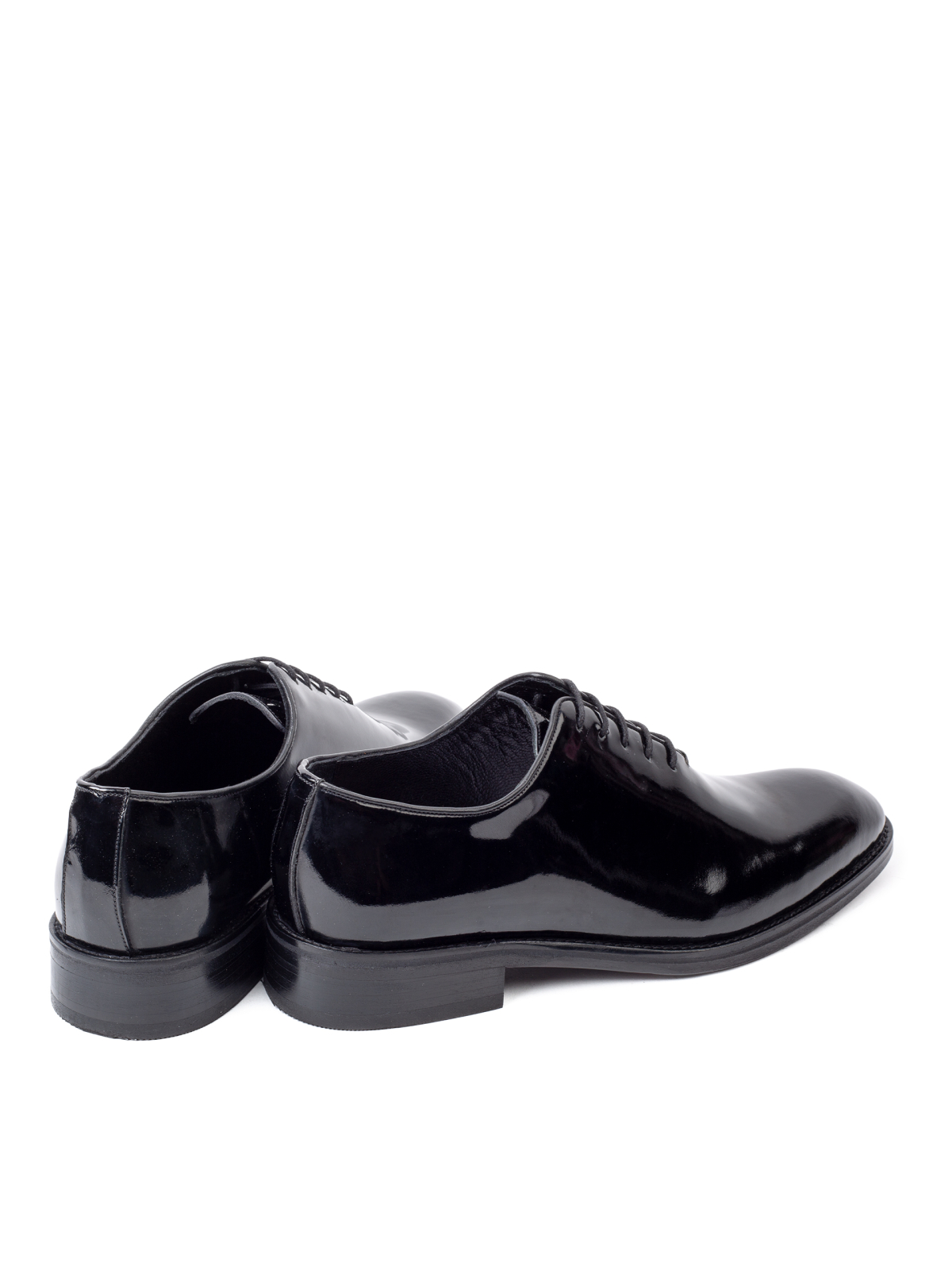Model Oxford realizat din piele naturală lăcuită, cu finisaj lucios intens și linie curată, fără perforații. Construcția închisă a șireturilor oferă un profil elegant și echilibrat, specific pantofilor formali. Talpa clasică și tocul discret completează silueta sobră, fiind potriviți pentru ținute de ceremonie, evenimente sau outfituri business formale.