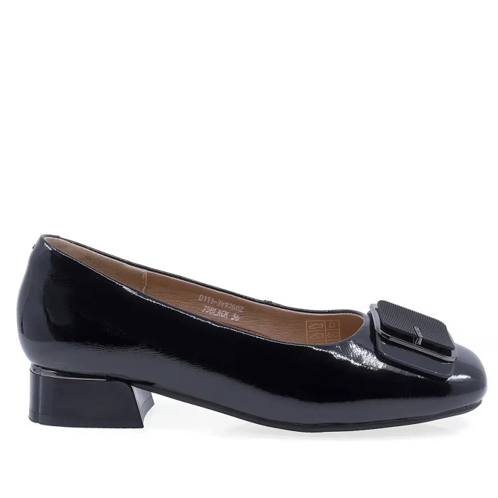 Pantofi dama Anna Viotti din piele naturala lacuita, in culoare neagra, cu toc mic de 4 cm. Interiorul din mesina naturala si talpa usoara din poliuretan asigura confort in purtare zilnica.