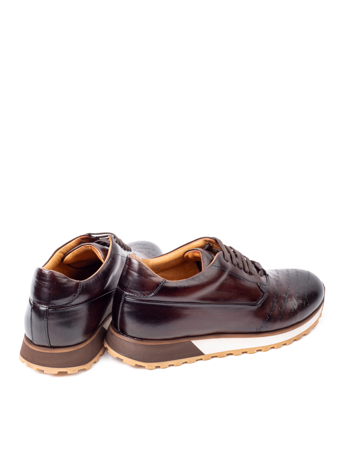 Modelul Urban Script Brown este realizat din piele naturală cu finisaj maro închis patinat, evidențiind nuanțe subtile și un aspect lucrat manual. Partea frontală este decorată cu un motiv gravat discret, care adaugă personalitate fără a încărca designul.